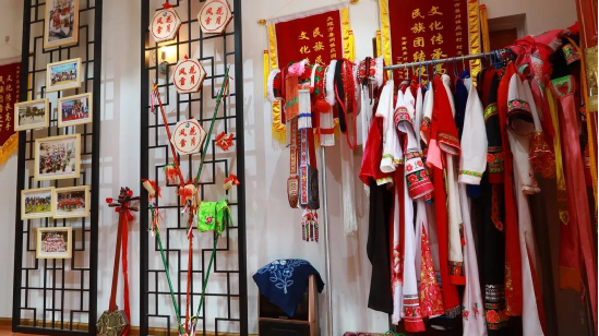 方正的堂屋里掛滿了何松康參加演出、培訓的各種照片及霸王鞭、八角鼓、服裝等演出道具。院子的墻上專門請人繪了一幅霸王鞭的彩繪,旁邊書寫:“弘揚白族傳統(tǒng)文化,傳承民間舞蹈藝術”。