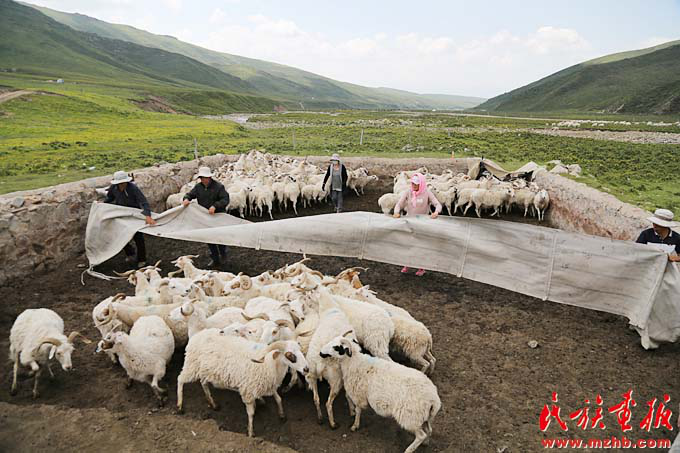 為響應(yīng)退牧還草政策,海晏縣哈勒景村的蒙古族牧民改變過(guò)去逐水草而居的生活,通過(guò)禁牧、以草定畜等措施改變草原生態(tài)。海云一家將羊群驅(qū)趕到一起為羊接種疫苗(陳濤 攝影)