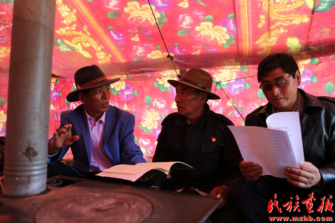 土旦(左)入戶向牧民宣傳草原法律法規(guī)和國(guó)家相關(guān)草原保護(hù)政策(黃若天 攝影)