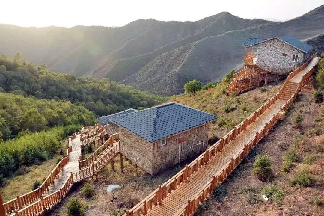 沿著木棧道,一路緩緩而行。滿山遍野的綠撲面而來,自然生長的白樺林,依山而建的鱗次櫛比的小木屋,78米高212米長的玻璃棧道,2萬平方米的水上樂園……人與景相依相融,林胡古塞處處充滿著現(xiàn)代與古樸結(jié)合的畫面。