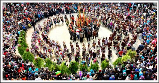 蘆笙踩堂開始時(shí),首先舉行開堂儀式,向蘆笙柱祭祀。蘆笙柱是苗族的圣物,用高達(dá)10米以上的完整杉木制作而成,柱頂立一只錦雞(苗族崇拜的一種鳥),雞頭向東,寓意吉祥;柱身盤著一條金龍,體現(xiàn)苗族與漢族的文化融合;還有苗族崇拜的牛角和十字架。寨老和蘆笙頭分別敬上三杯酒和燒三柱香,感謝神靈和祖宗保佑,祈求坡會(huì)成功、新年萬事如意。緊接著,蘆笙頭拿起小蘆笙,圍繞一個(gè)曲調(diào)反復(fù)吹三遍,拉開蘆笙踩堂表演的序幕。