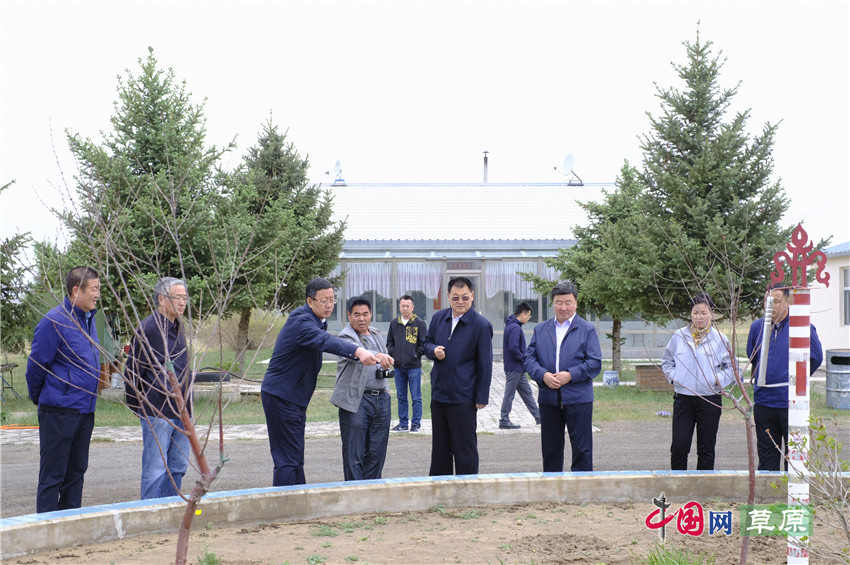 廷·巴特爾向前來考察調(diào)研的全國(guó)政協(xié)人口資源環(huán)境委員會(huì)副主任任亞平(右四)、錫林郭勒盟委書記羅虎在(左三)介紹牧場(chǎng)情況
