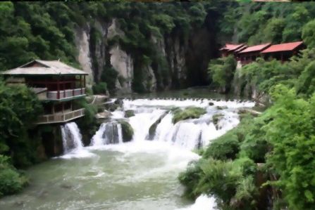 水洞下游有臥龍湖,水清可鑒,湖邊排列著水車、水碾、水磨、“香粑車”等等往時(shí)鄉(xiāng)間常見(jiàn)的農(nóng)家物,給人以既古樸又清新的感覺(jué)。與臥龍湖相連的是一處罕見(jiàn)的鈣化灘,足有200米長(zhǎng),灘面上瀑布流瀉,水簾溶洞星羅棋布,植被茂密,堪稱喀斯特景貌的一絕。這一帶,春來(lái)桃花爛漫,夏臨蘭草吐芳,金秋野菊盛開,初冬火棘紅艷,一年四季,風(fēng)景如畫。