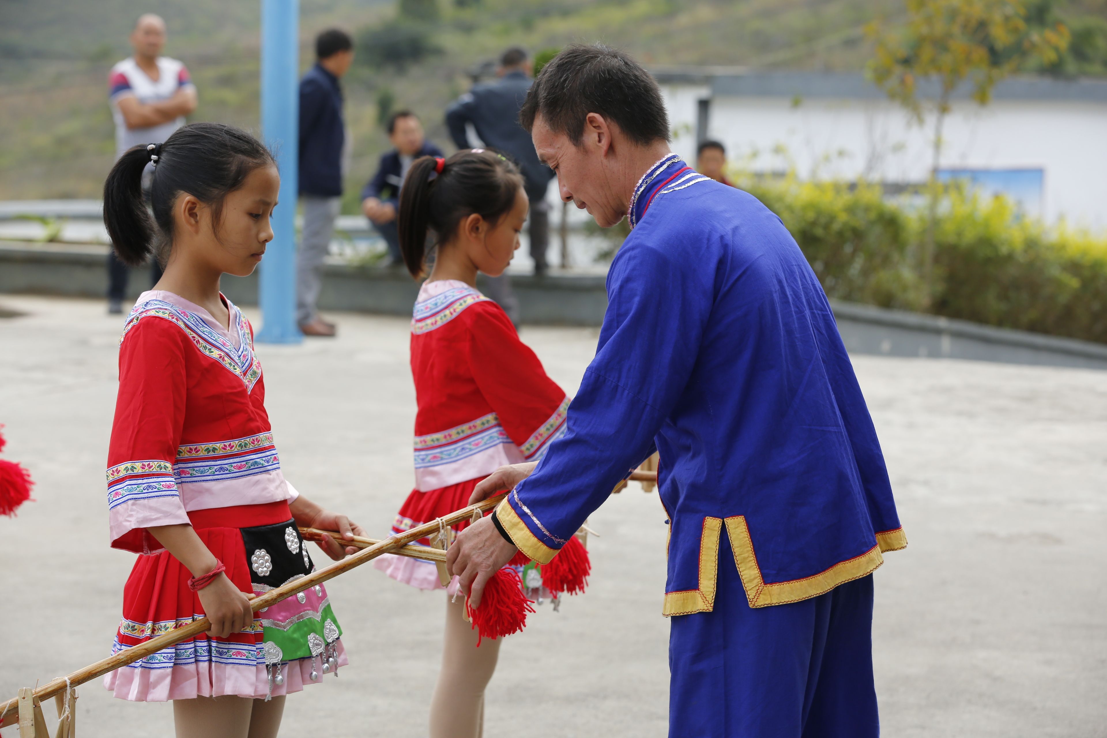 貴州貴陽苗族長竹舞傳承人教孩子們持竿手法